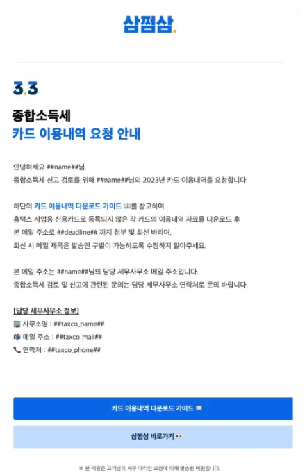 발신자 : 삼쩜삼TA 계정 아이디와 동일한 세무담당자 이메일주소 (수정 가능)