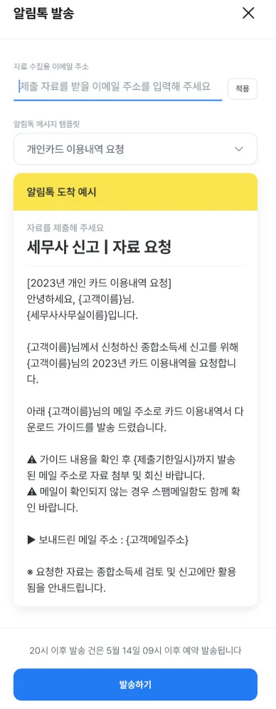 TA접속 > TAXDOC(신고서) 접속 > 우측 [알림톡 발송하기] 클릭 > 개인카드 이용내역 요청