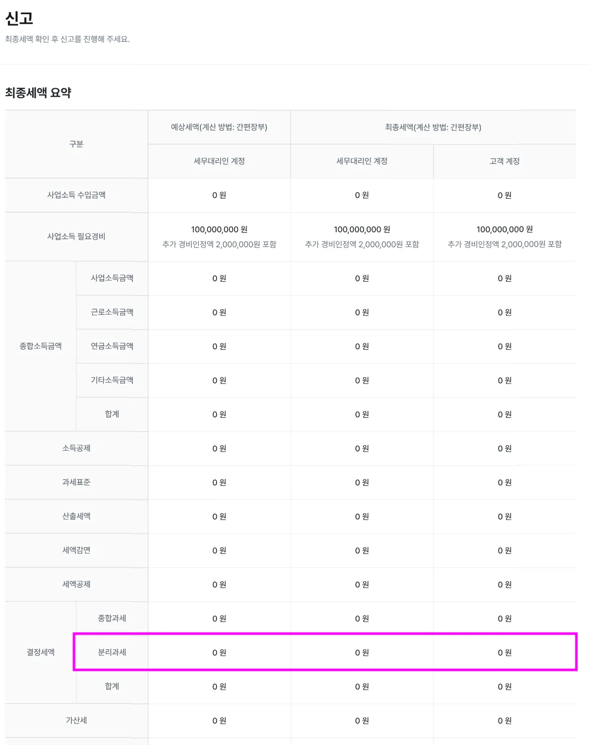 ※종합과세가 더 유리한 경우에는 [분리과세 결정세액] 탭에 계산값이 노출되지 않습니다.