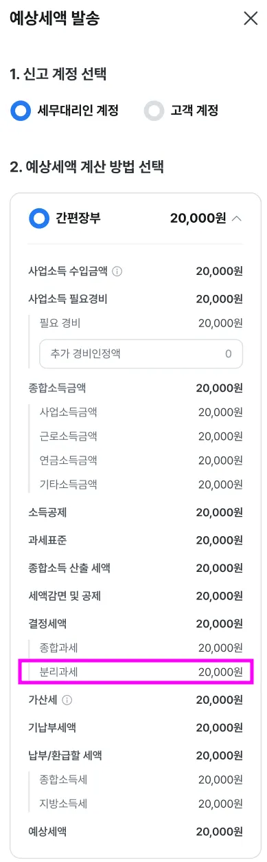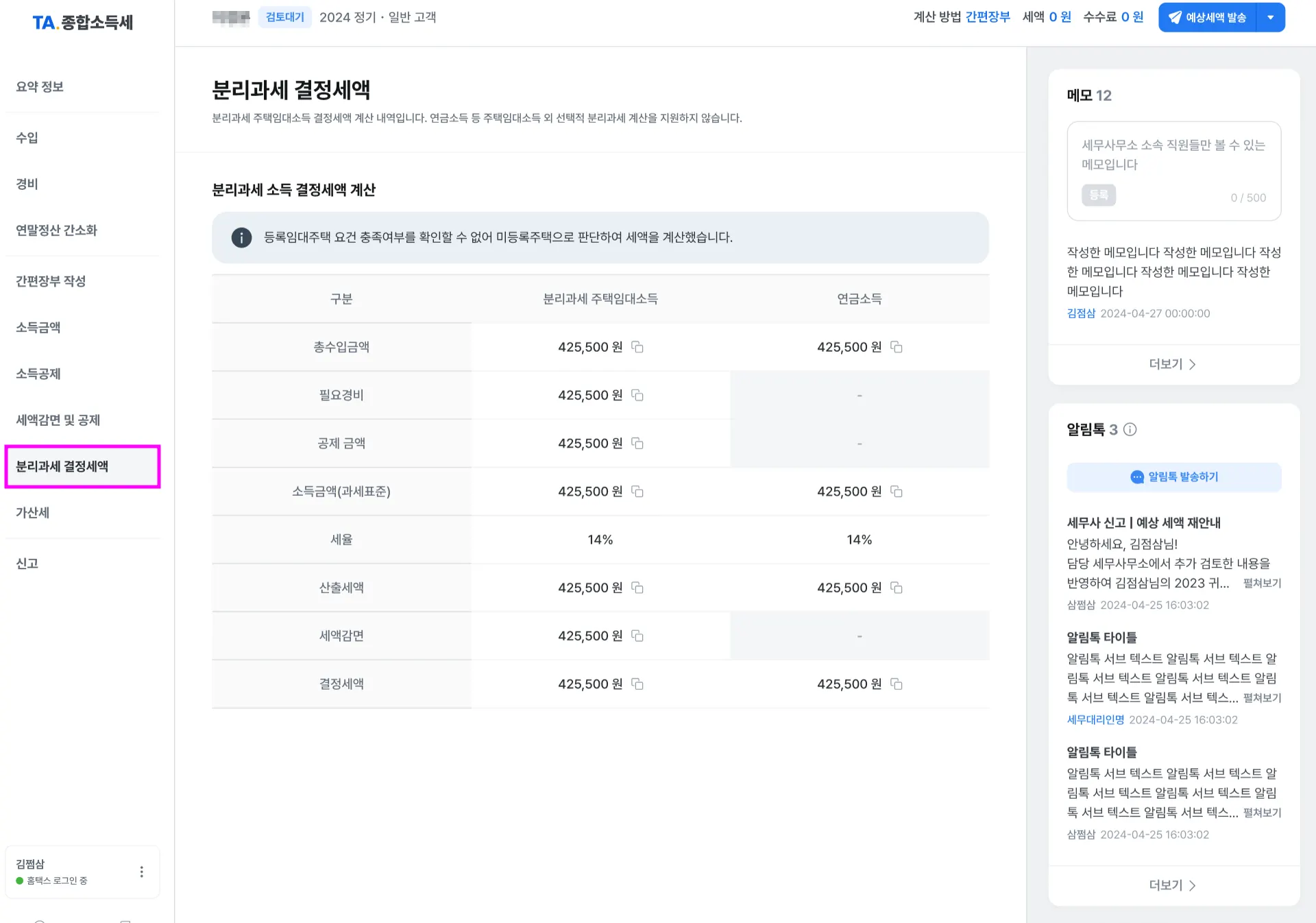 TA 내 예상세액 발송 및 신고 탭을 통해서도 분리과세 확인이 가능해요 (하단 이미지 참고)