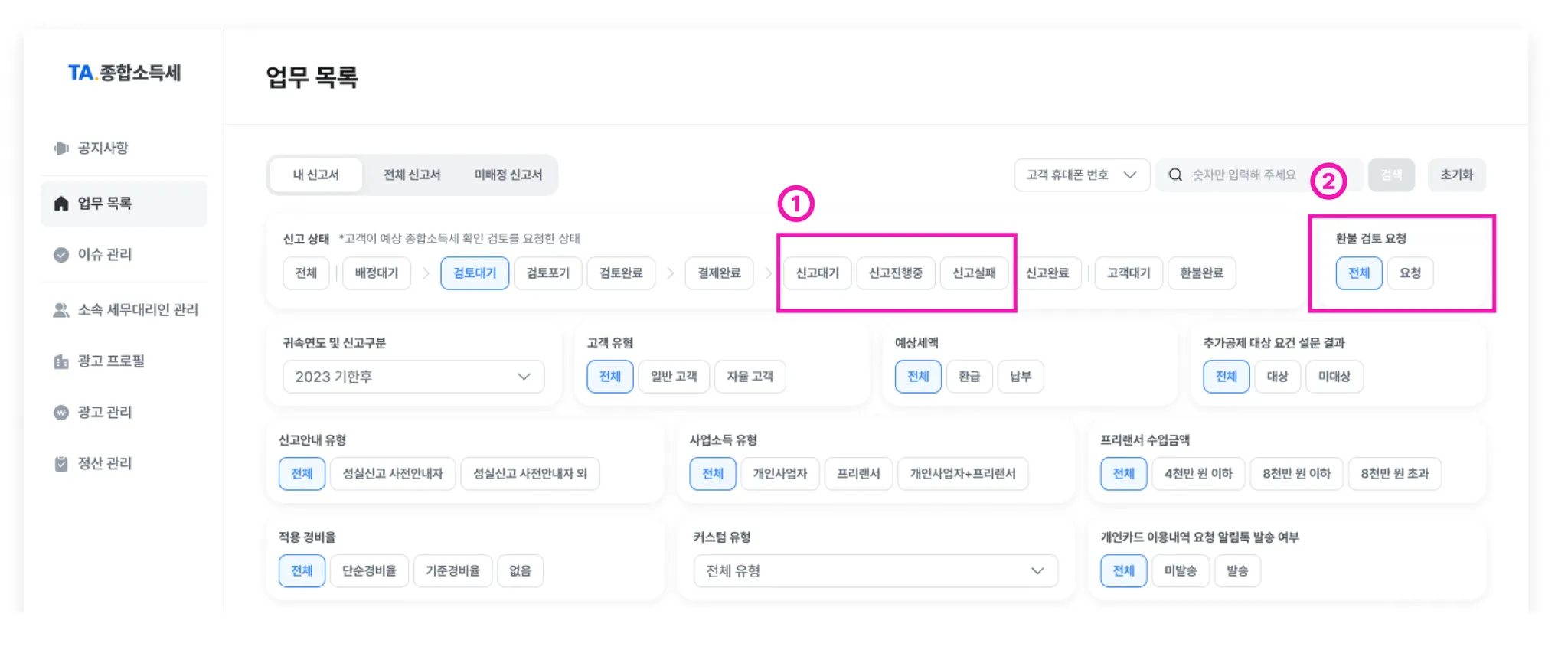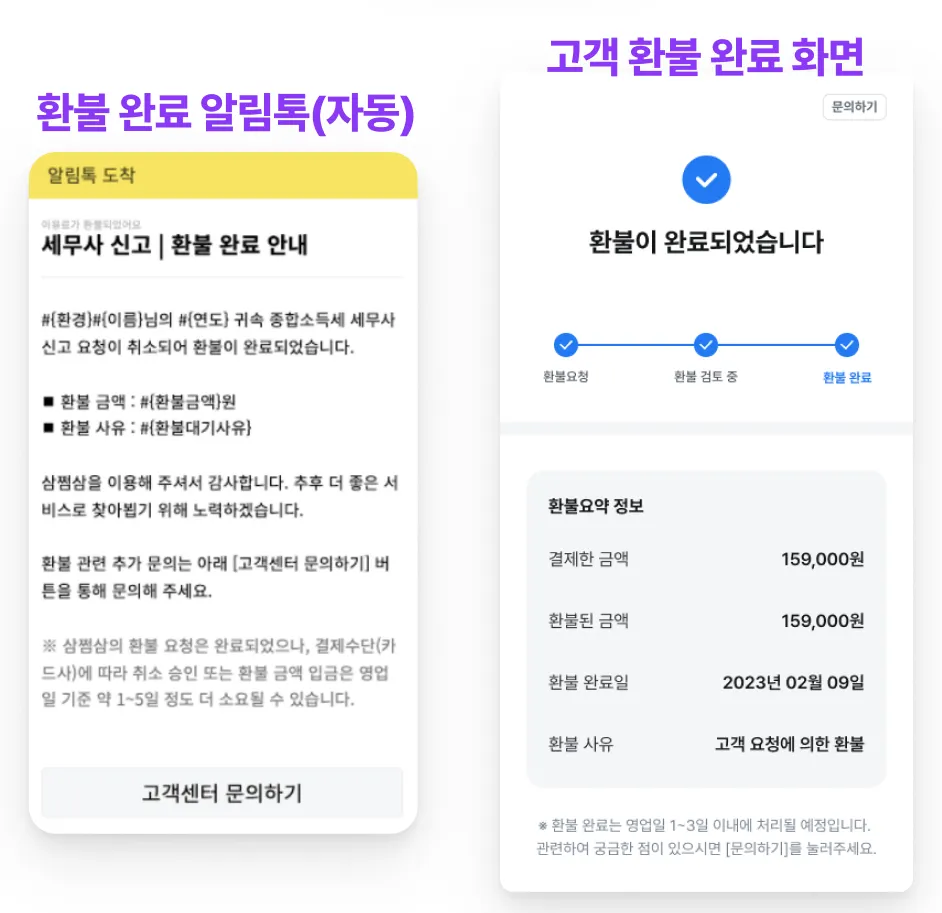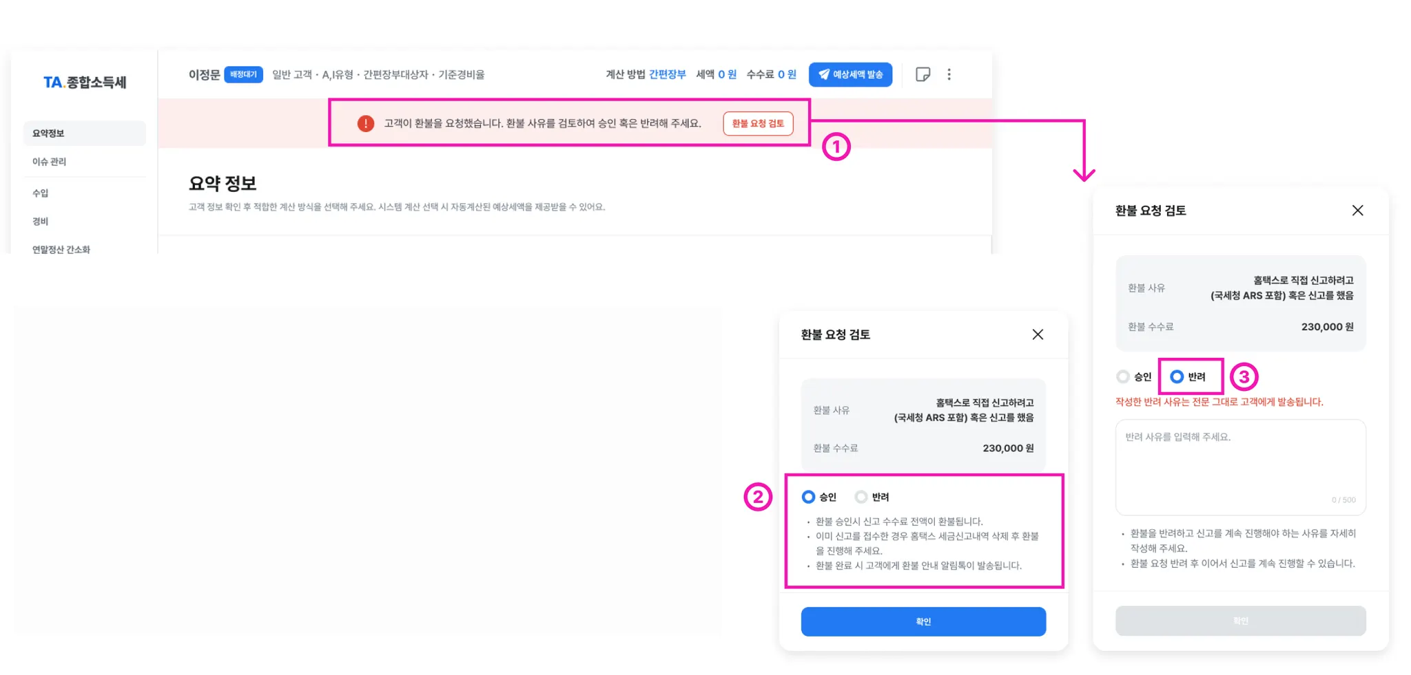 ‘고객’은 신고완료 전이라면 세무대리인에게 환불을 요청할 수 있고, 세무대리인은 요청 건을 검토할 수 있습니다.