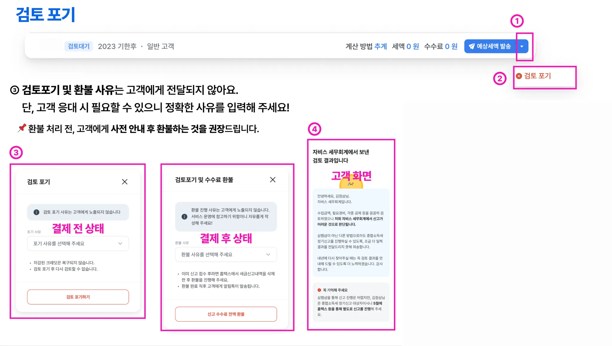 ※ 검토포기 및 환불 사유는 고객에게 전달되지 않아요. 단, 세무대리인께서 고객 응대 시 필요할 수 있으니 정확한 사유를 입력해두는 것을 추천드립니다!