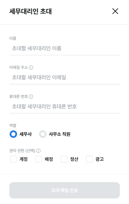 역할 : 실제 세무대리 자격증이 있는 직원만 초대해 주세요. 가입 단계에서 세무대리 자격증을 검증하고 있습니다.