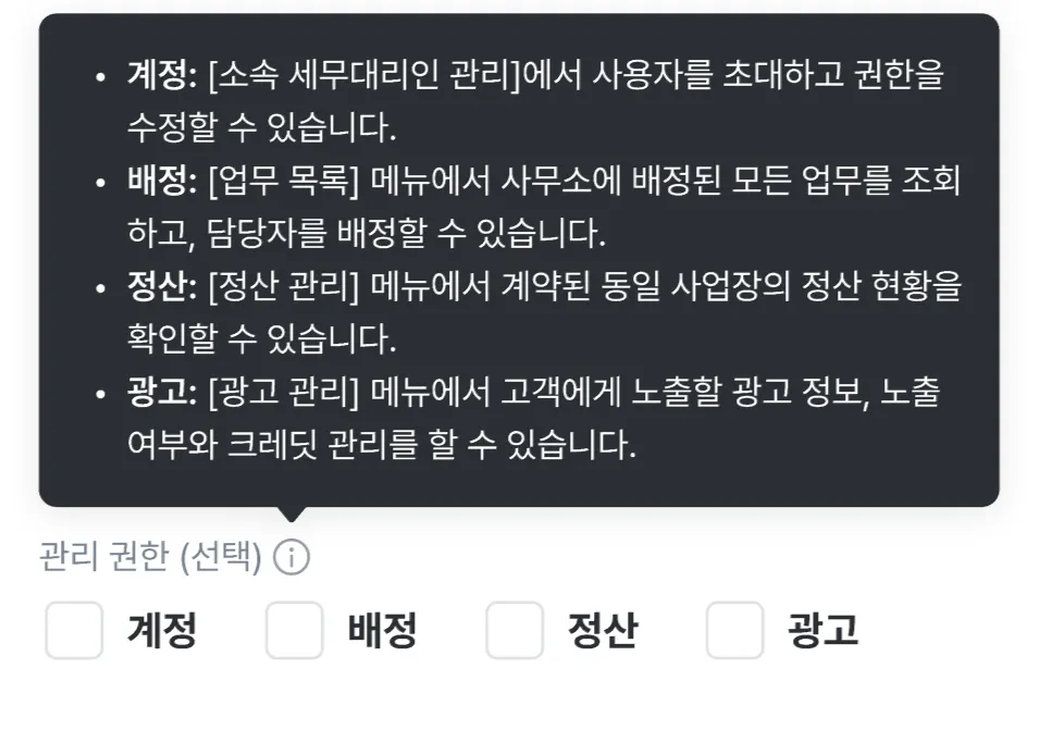 - 계정 : [소속 세무대리인 관리] 에서 사용자를 초대하고 권한을 수정할 수 있습니다.