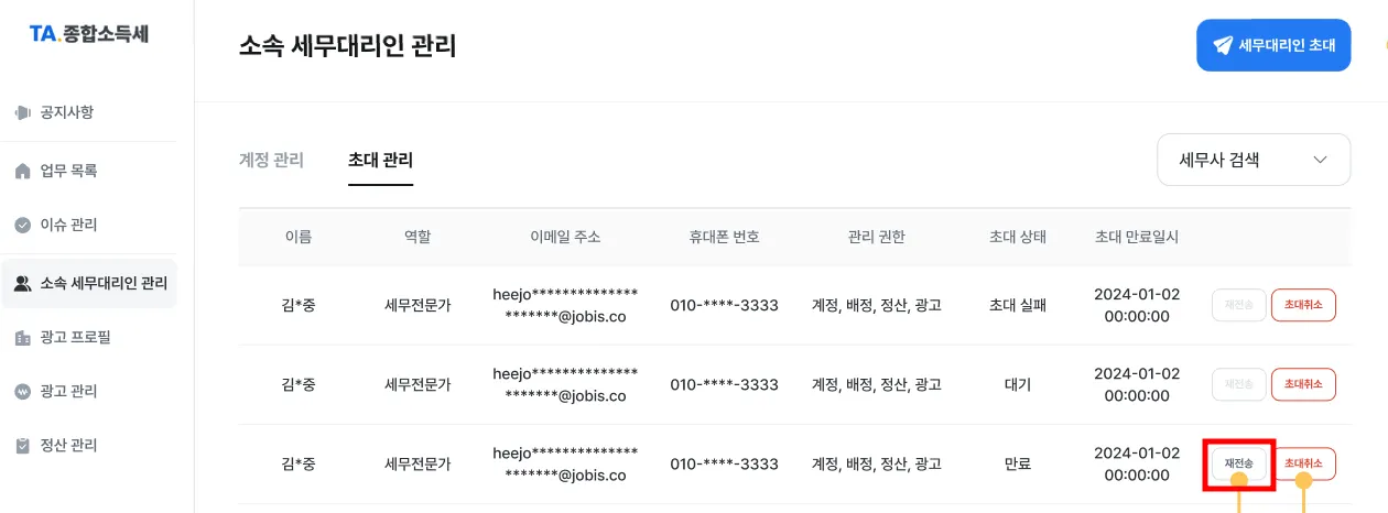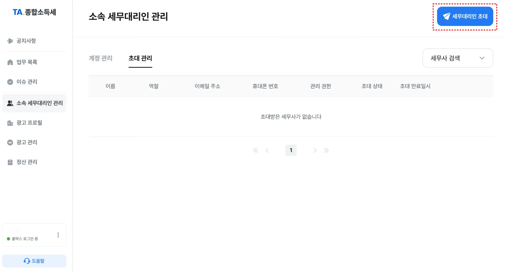 [소속 세무대리인 관리] 메뉴 > 우측상단 [세무대리인 초대] 버튼 클릭