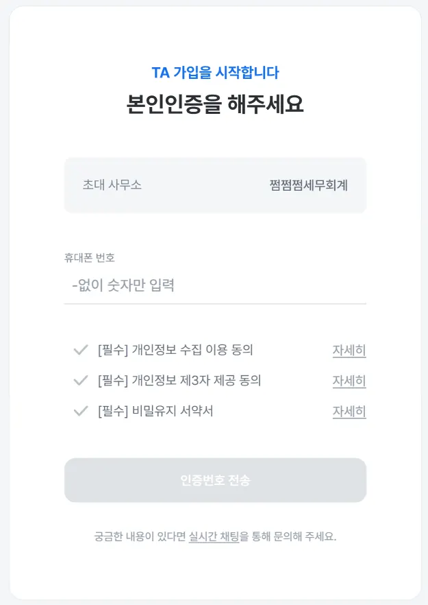 회원가입 이후에도 TA 로그인 시 휴대폰번호로 인증 절차가 필요합니다.