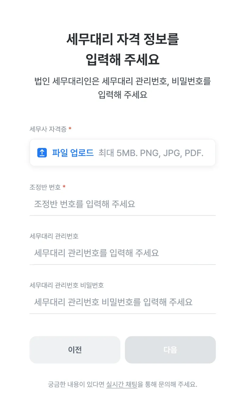 TA 계정의 역할이 ‘세무사’인 경우에만 자격 정보를 입력하게 됩니다.