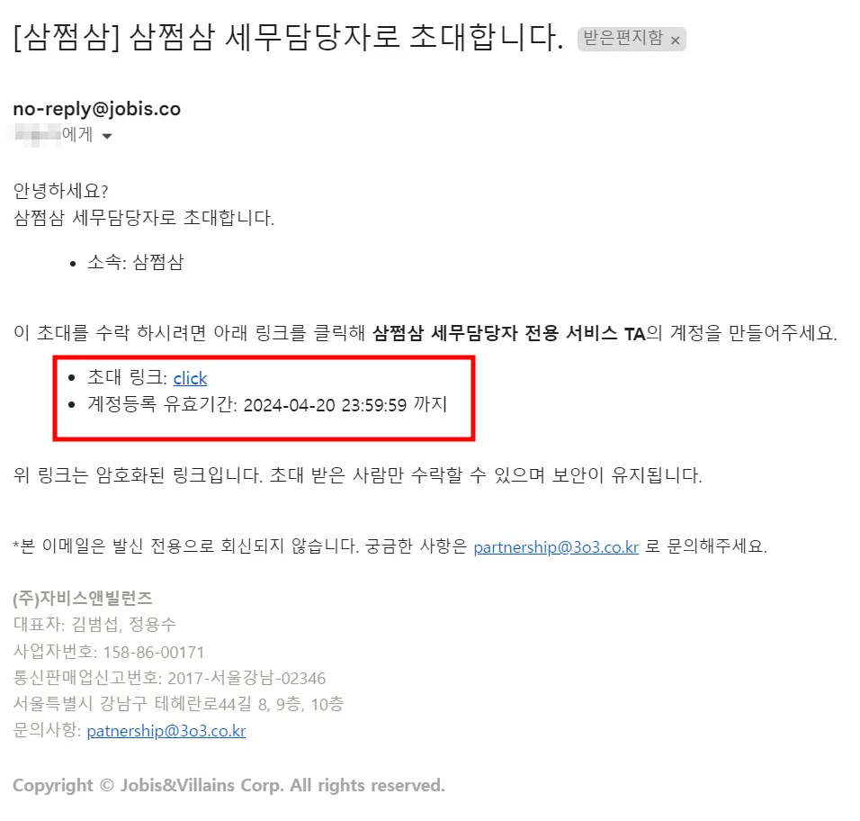 1. 우리 사무소(회사) TA 계정은 삼쩜삼에서 계약 체결한 대표 세무사에게 최초 초대 메일을 보내드립니다.