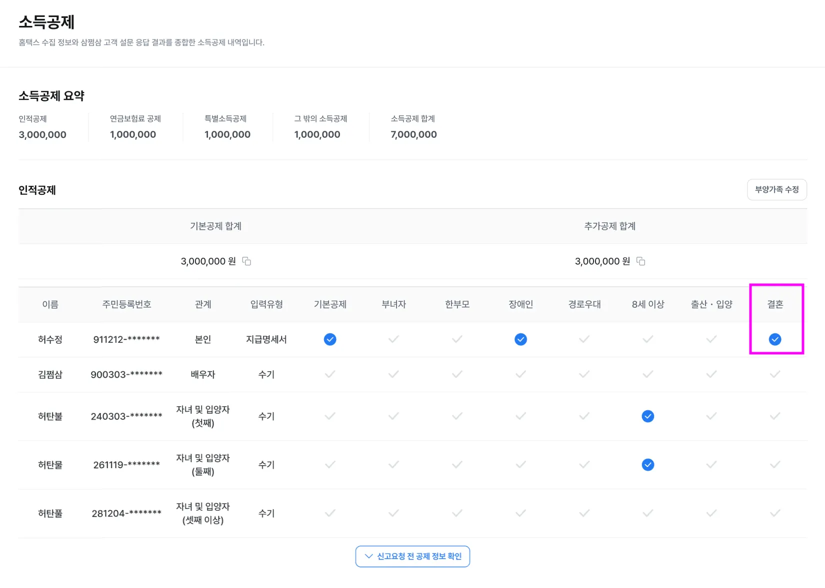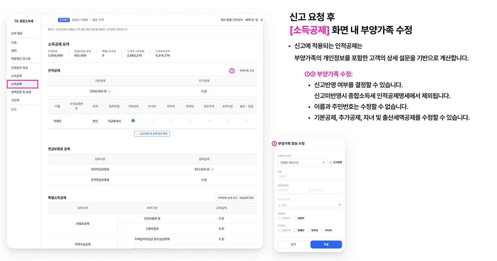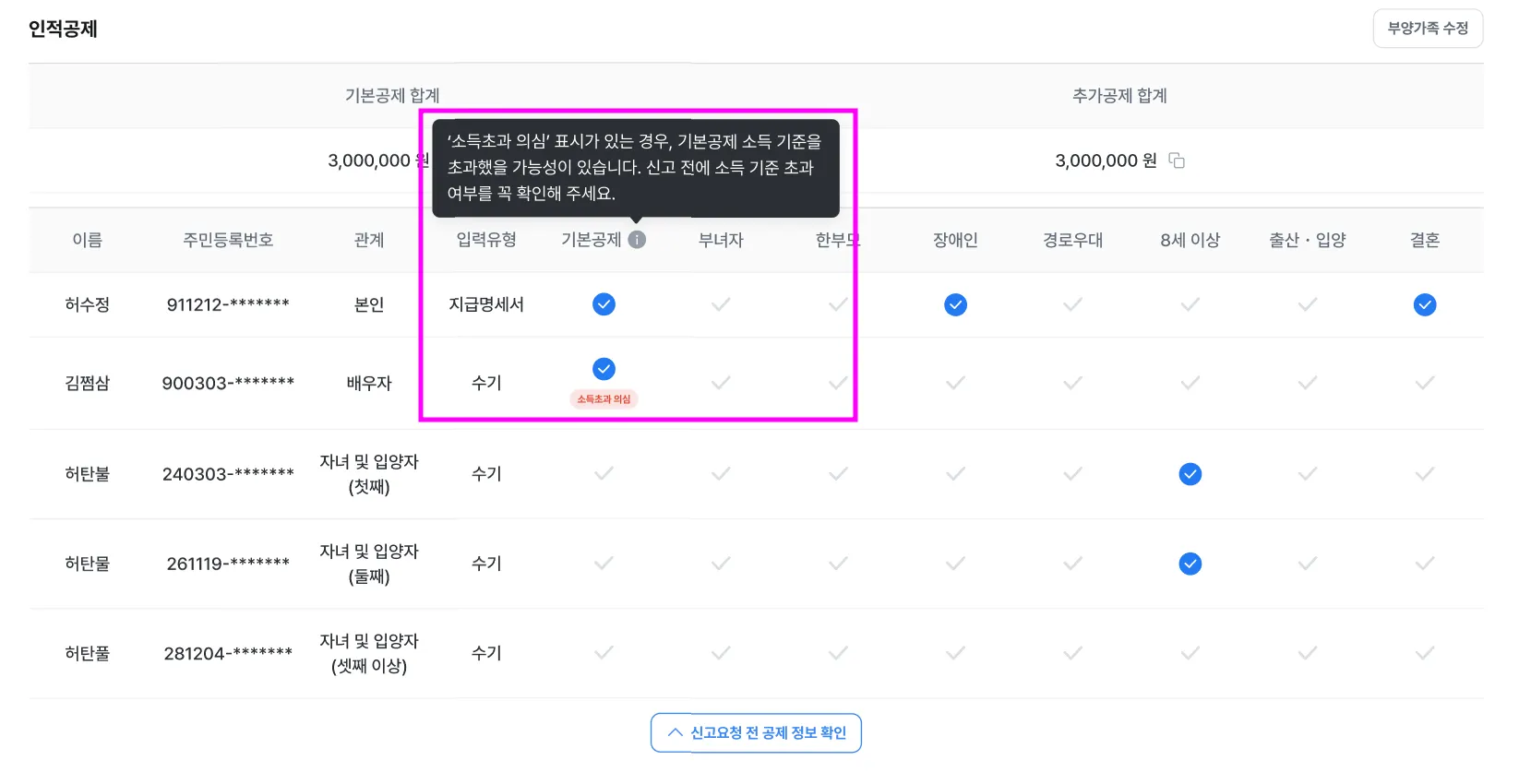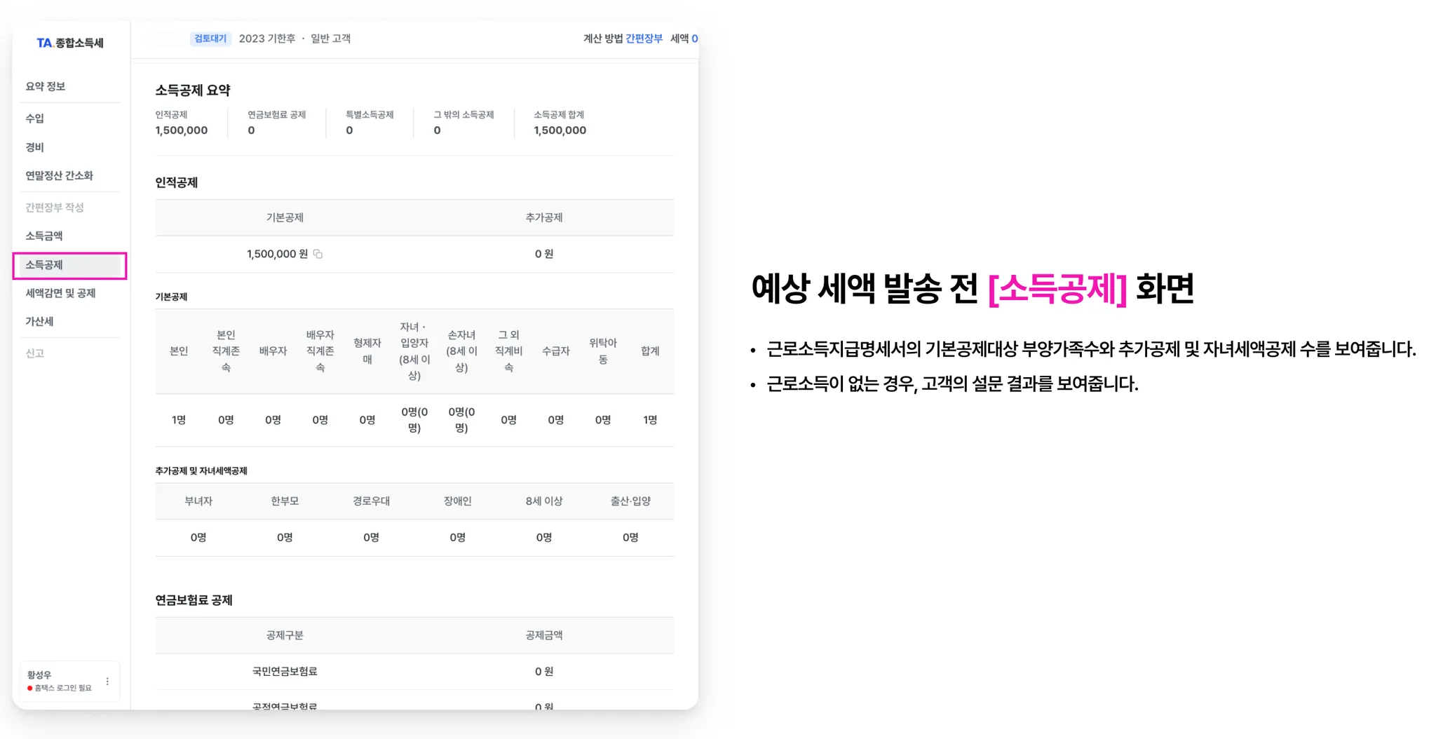 신고에 적용되는 인적공제는 부양가족의 개인정보를 포함한 고객의 상세 설문을 기반으로 계산합니다.