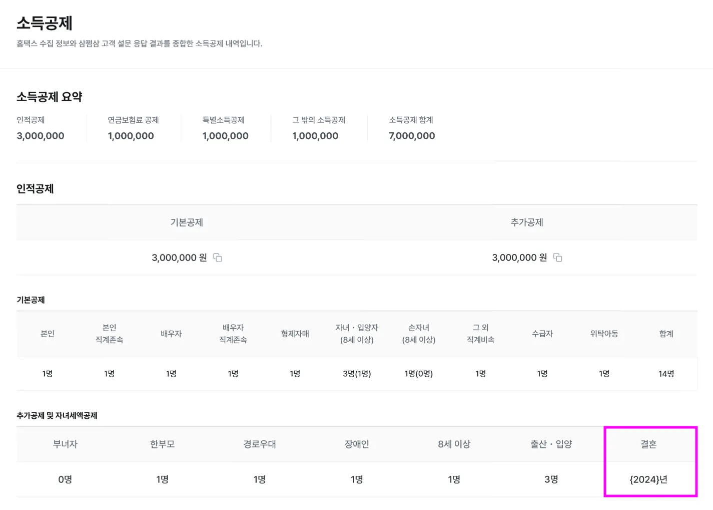 ‘배우자와 혼인신고한 연도’가 2024년도인 경우 인적공제란을 통해 확인 가능해요.