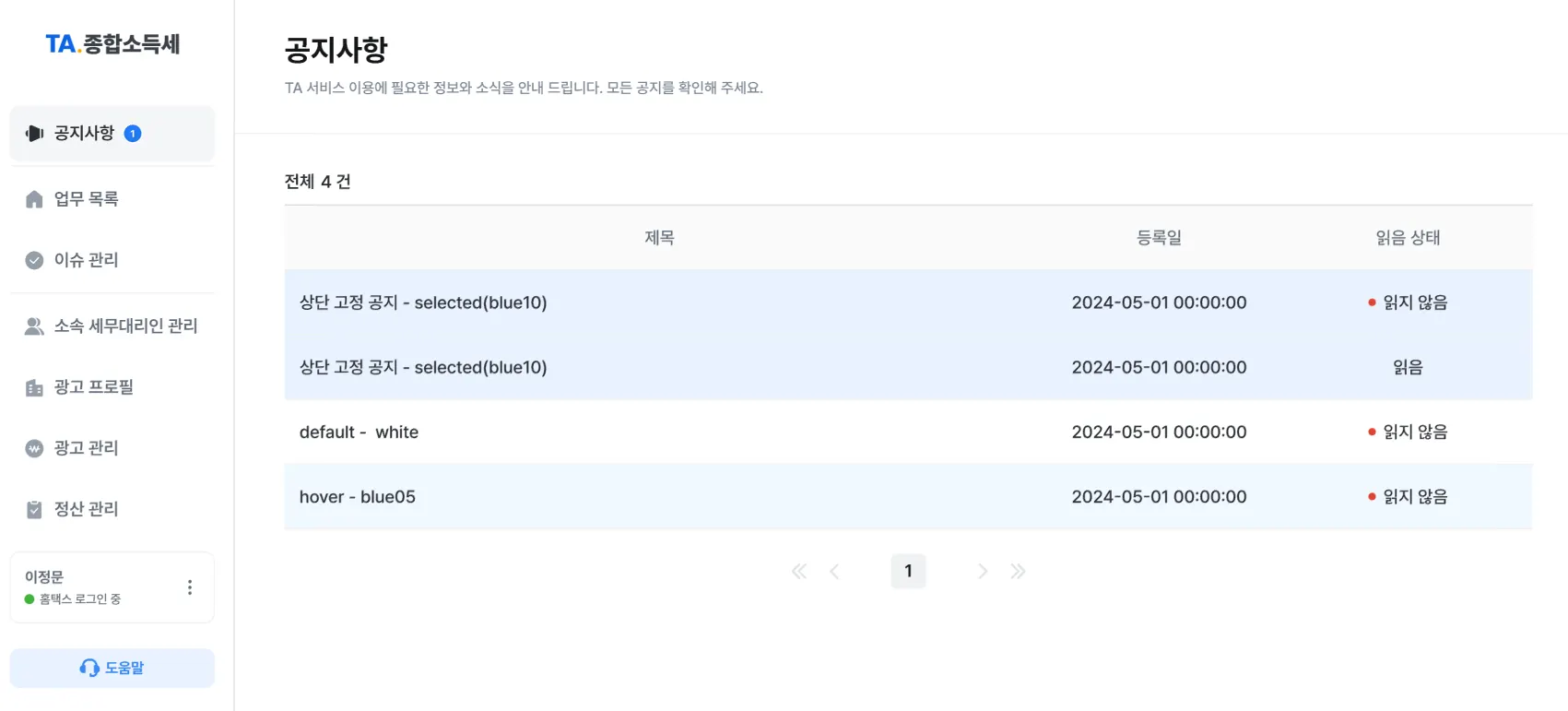 TA 진입 > 좌측 상단 [공지사항] 메뉴