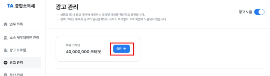광고 노출 여부와 크레딧을 직접 충전하고 관리할 수 있습니다.