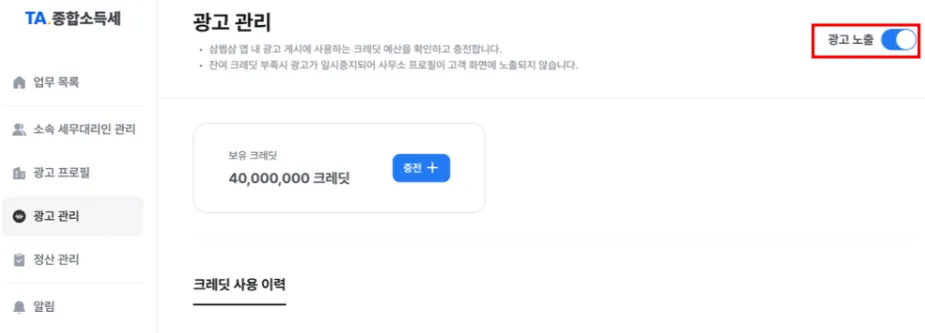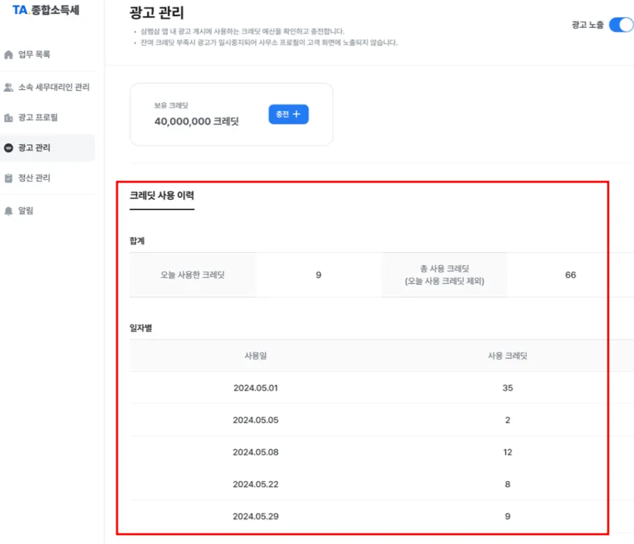 [광고 관리] 메뉴 > 크레딧 사용 이력