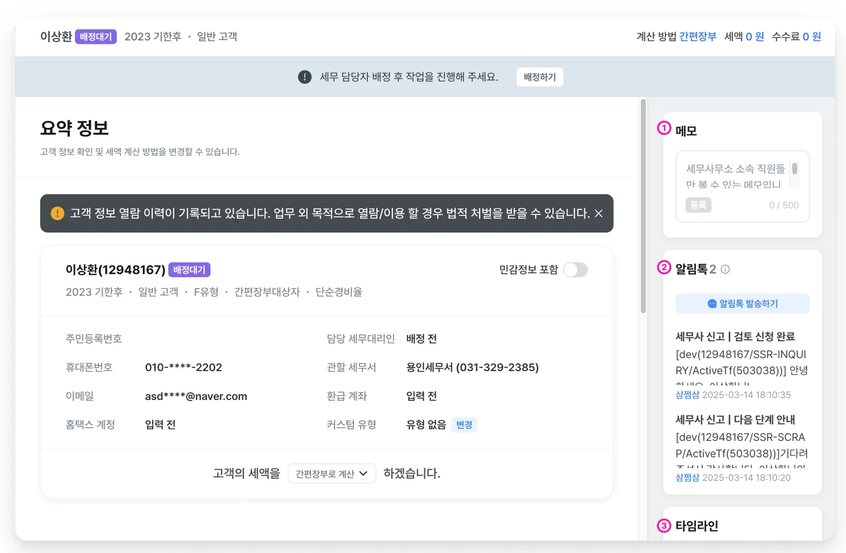 알림톡 발송, 예상세액 발송, 검토 포기, 신고 완료, 환불, 결제 완료, 세무담당자 배정 등을 수행한 시간과 세부 내역을 확인할 수 있습니다.