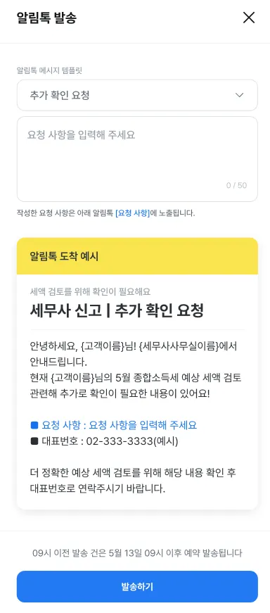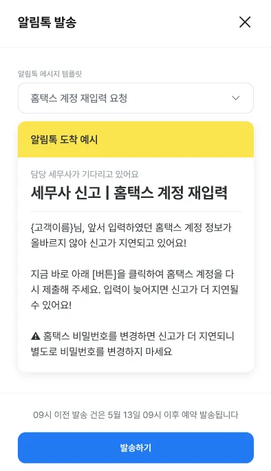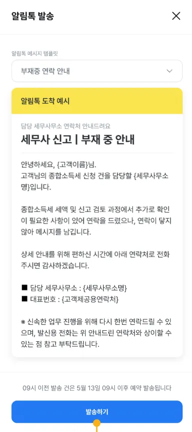 늦은시간 (20:00 ~ 9:00)에는 세무사님께서 알림톡 발송하기를 클릭해도 바로 발송되지 않고 다음 오전 9시에 일괄적으로 자동 발송돼요! 그러니 안심하고 마음껏 발송처리 해 주세요!
