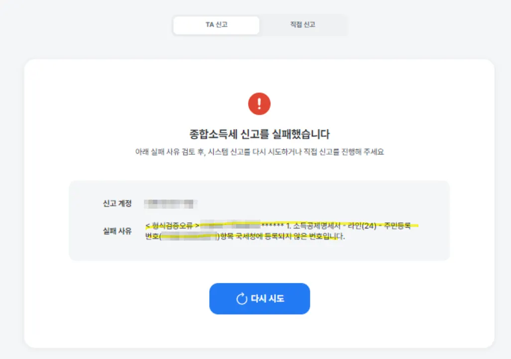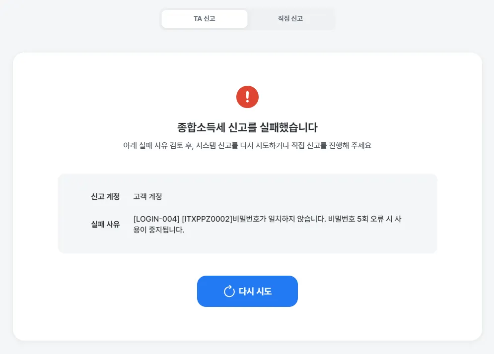 고객계정 신고 시 홈택스 비밀번호 에러가 발생 시 고객에게 재수집을 요청하여 고객계정으로 TA신고를 진행할 수 있습니다