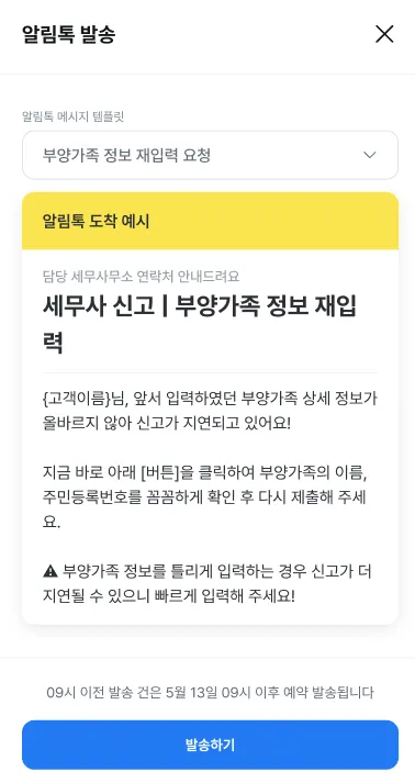 부양가족 정보로 인한 에러 발생 시, 고객에게 해당 알림톡을 발송하여 본인 및 부양가족 정보(이름, 주민등록번호 등)을 재수집 할 수 있어요