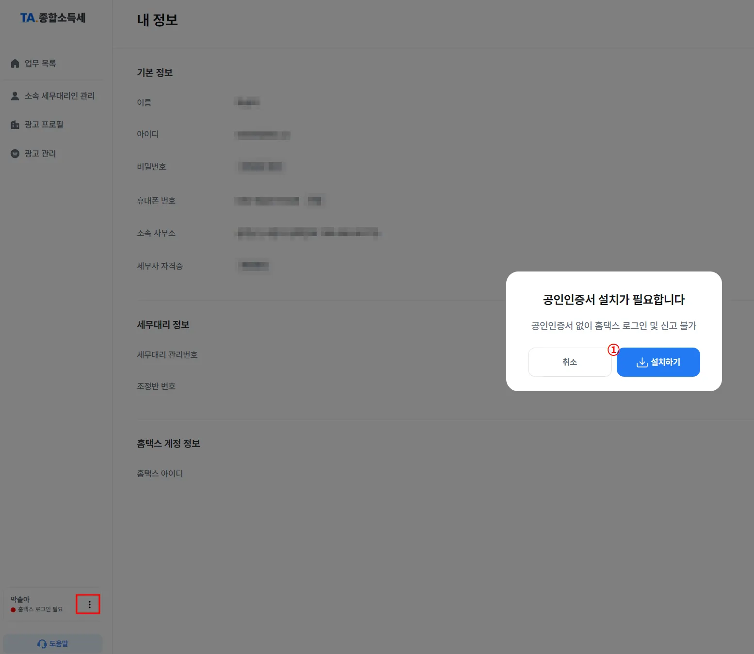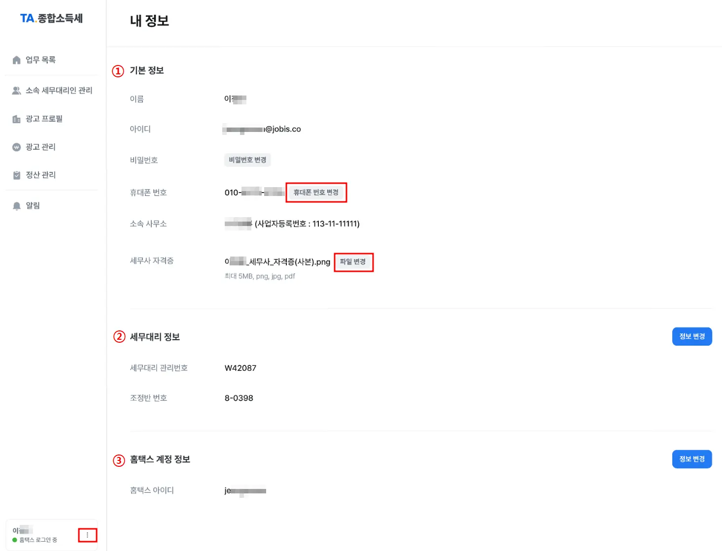 ① 기본 정보 : 나의 계정의 비밀번호, 휴대폰 번호, 세무사 자격증 파일을 직접 수정할 수 있어요.