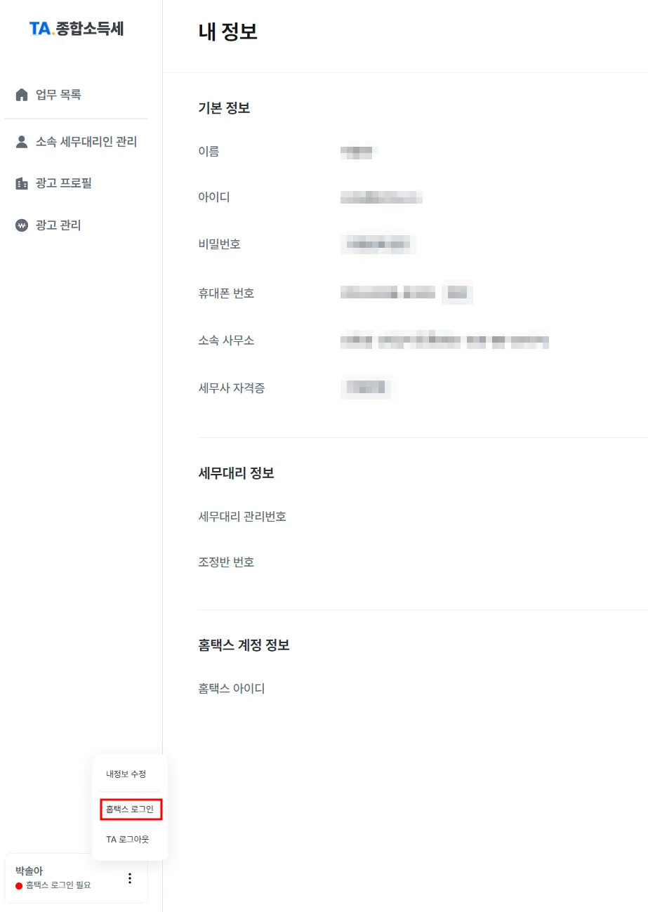 홈택스 로그인 필요’ 인 경우, TA신고가 불가능해요.
