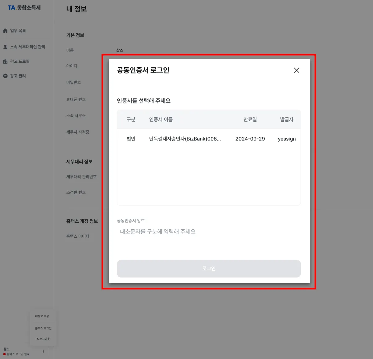 공동인증서 설치 후 > 다시 TA에 돌아가 > 홈택스 로그인 클릭