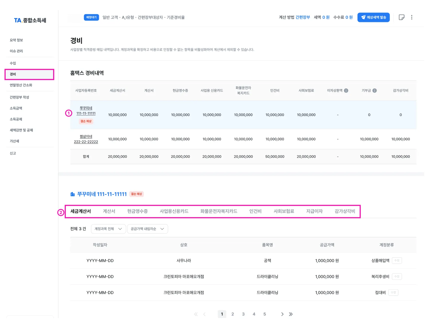 ① 홈택스 경비 내역 : 고객의 모든 사업장별 홈택스 경비 내역을 확인할 수 있습니다.