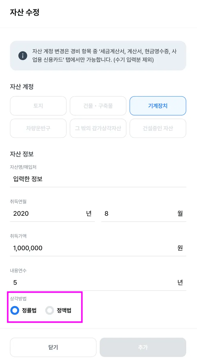 기계장치, 차량운반구 계정에 한하여 무조건 정액법이었던 계산 방식이 정액법 / 정률법 둘 중 선택할 수 있게 고도화 되었어요.