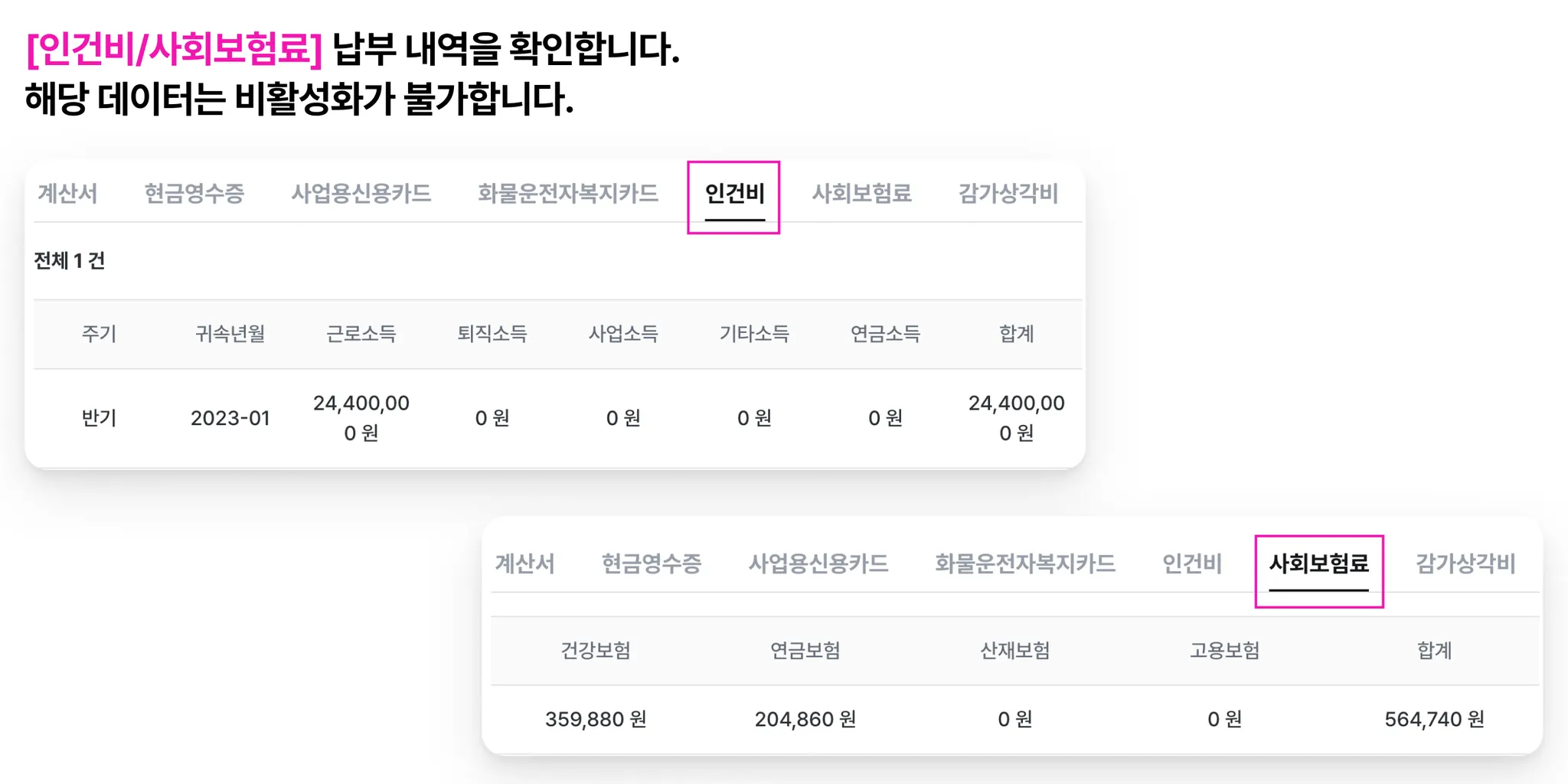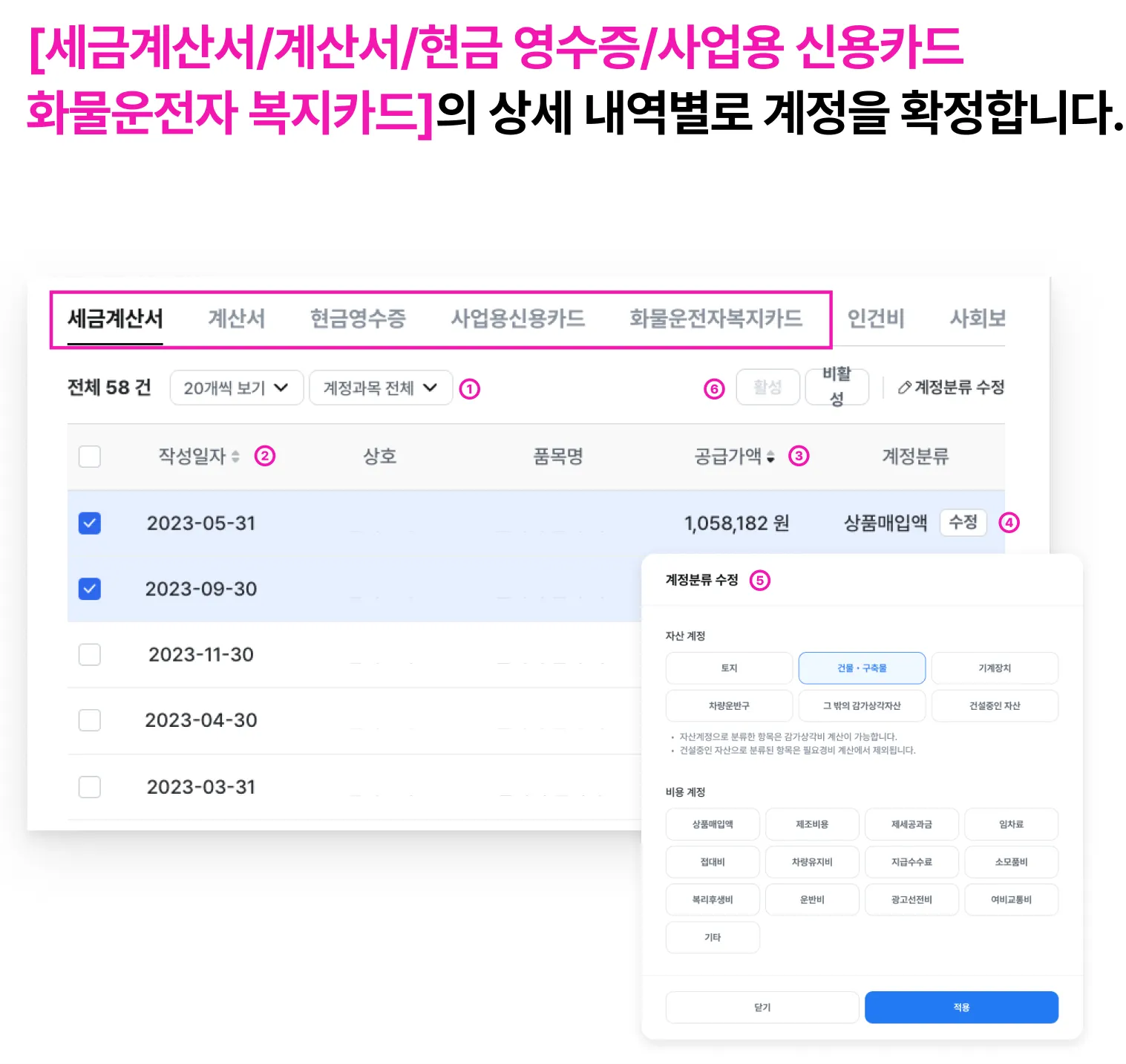 (세금계산서, 계산서, 현금영수증, 사업용신용카드, 화물운전자 복지카드, 인건비, 사회보험료)