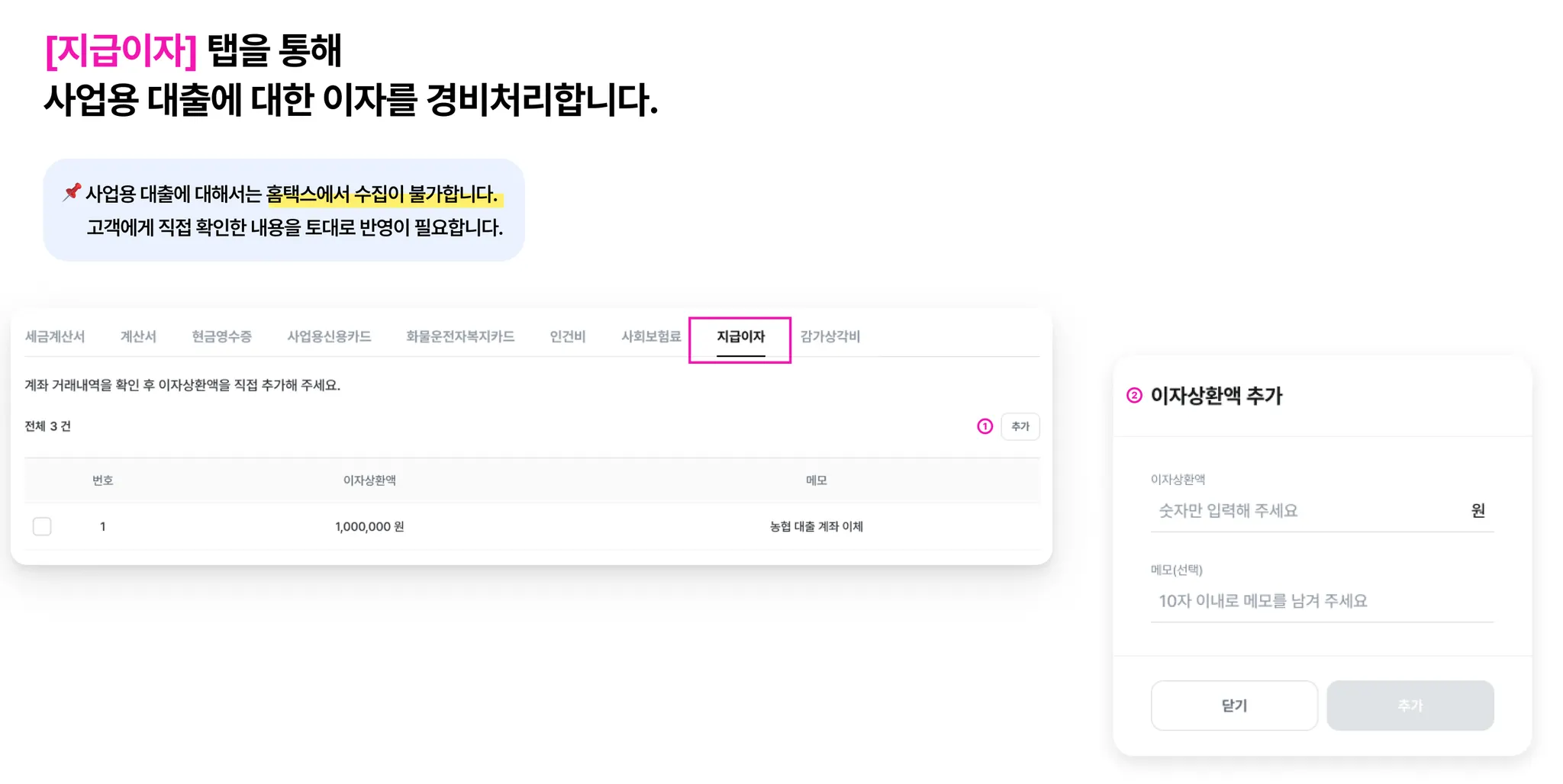 이자상환액 : 사업에 사용한 금융비용을 하단의 ‘지급이자’ 탭에서 등록할 수 있습니다.