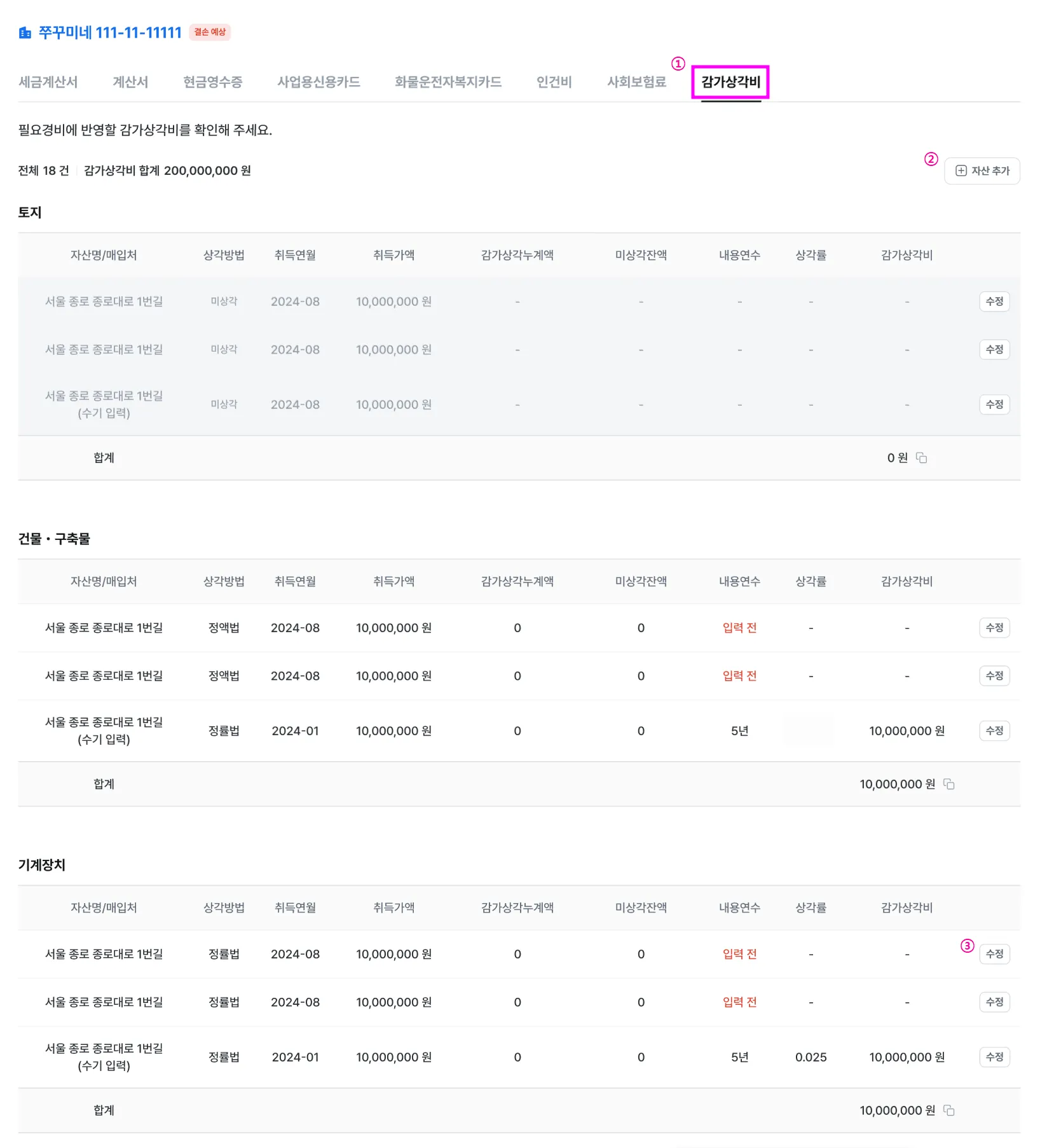 자산 추가 기능이 생겨, 과거 자산도 추가하여 감가상각비를 처리할 수 있게 되었어요.